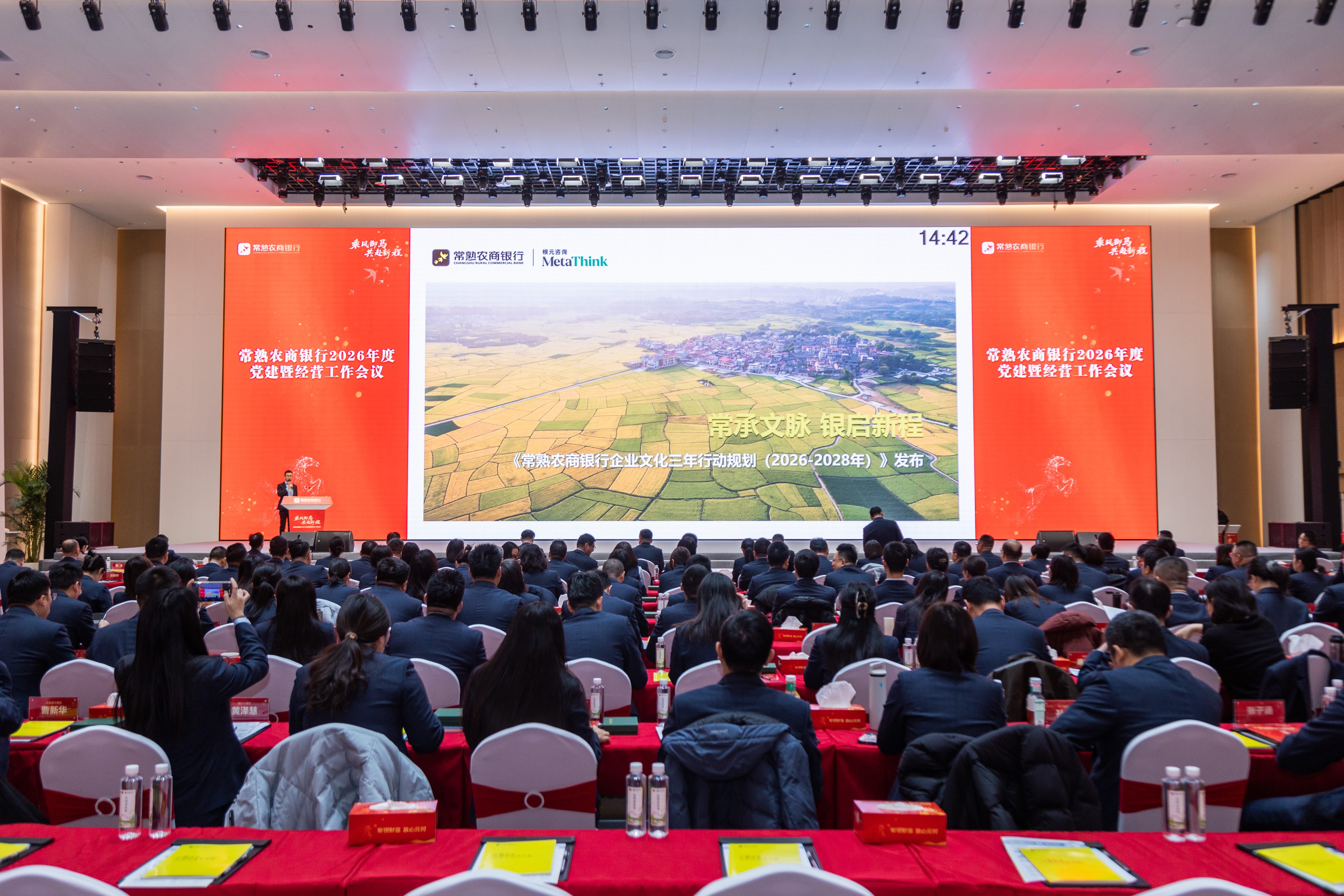 近日,常熟农商银行正式发布《企业文化三年行动规划(2026-2028年)》及《企业文化手册》,这是常熟农商银行携手根元咨询开展的企业文化升级项目的阶段性成果。常熟农商银行党委书记、董事长薛文,党委副书记陆鼎昌,根元咨询联合创始人周文共同登台,与现场同仁一齐见证这一重要时刻。根元咨询总监、MetaThink人文商业研究院高级研究员徐一超系统解读了企业文化三年行动规划及其背后的思考。